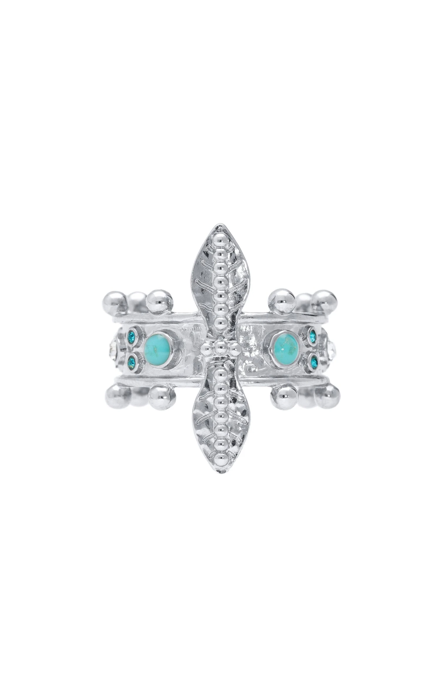 Cet hiver, vous allez raffoler de cette petite merveille prĂ©cieuse! Cette bague en laiton argentĂ© plaquĂ© au palladium, 0,3 microns, à la particularitĂ© d’ĂŞtre amovible et s’adapte Ă toutes les tailles. Elle est dĂ©corĂ©e de petites billes argentĂ©es et de palmettes centrales qui rappellent les bijoux anciens de l’Ă©poque italienne. Elle est dĂ©corĂ©e de points d’Ă©mail turquoise et pavĂ©e de strass de couleur turquoise, blanc effet diamant et violet amĂ©thyste.