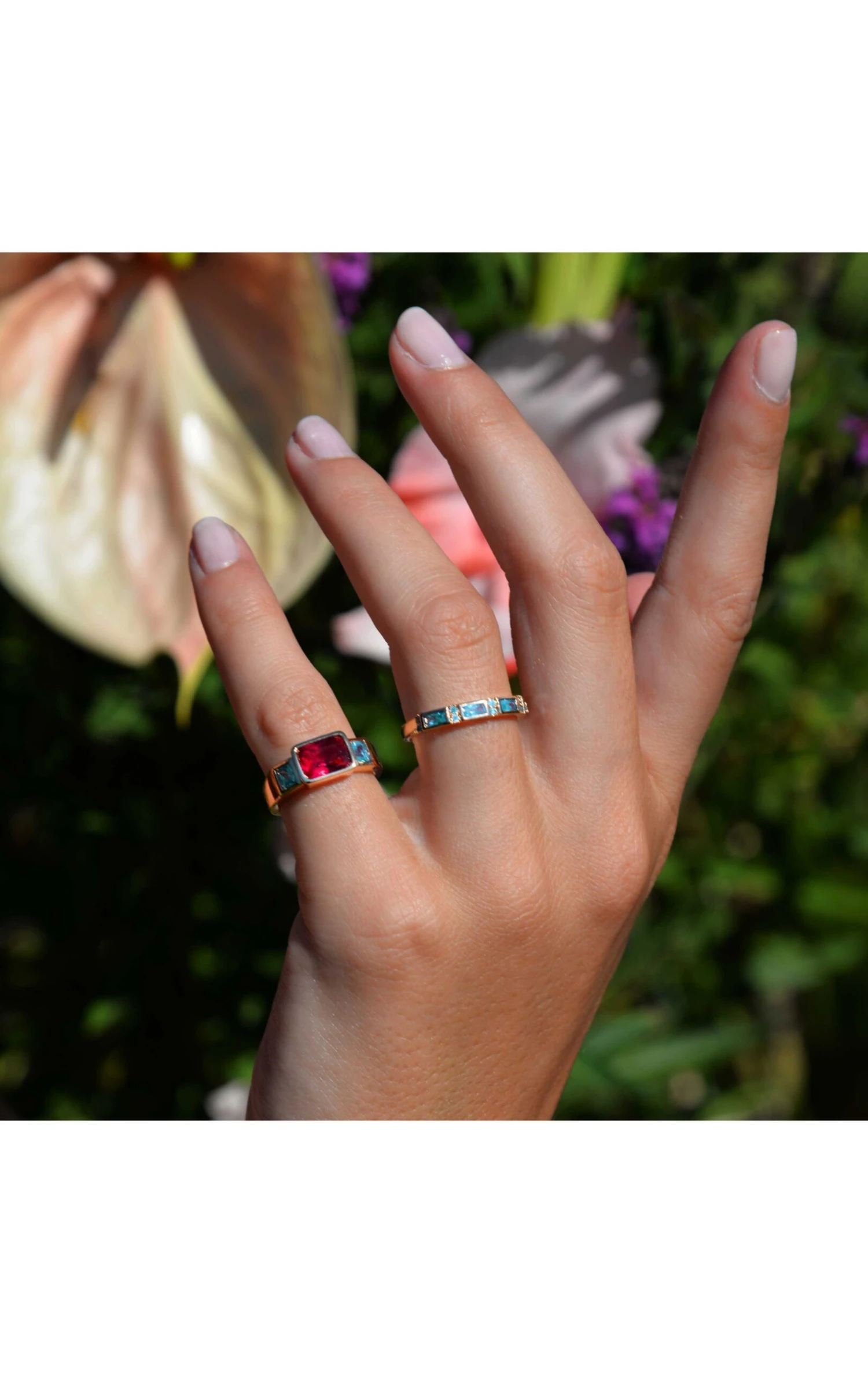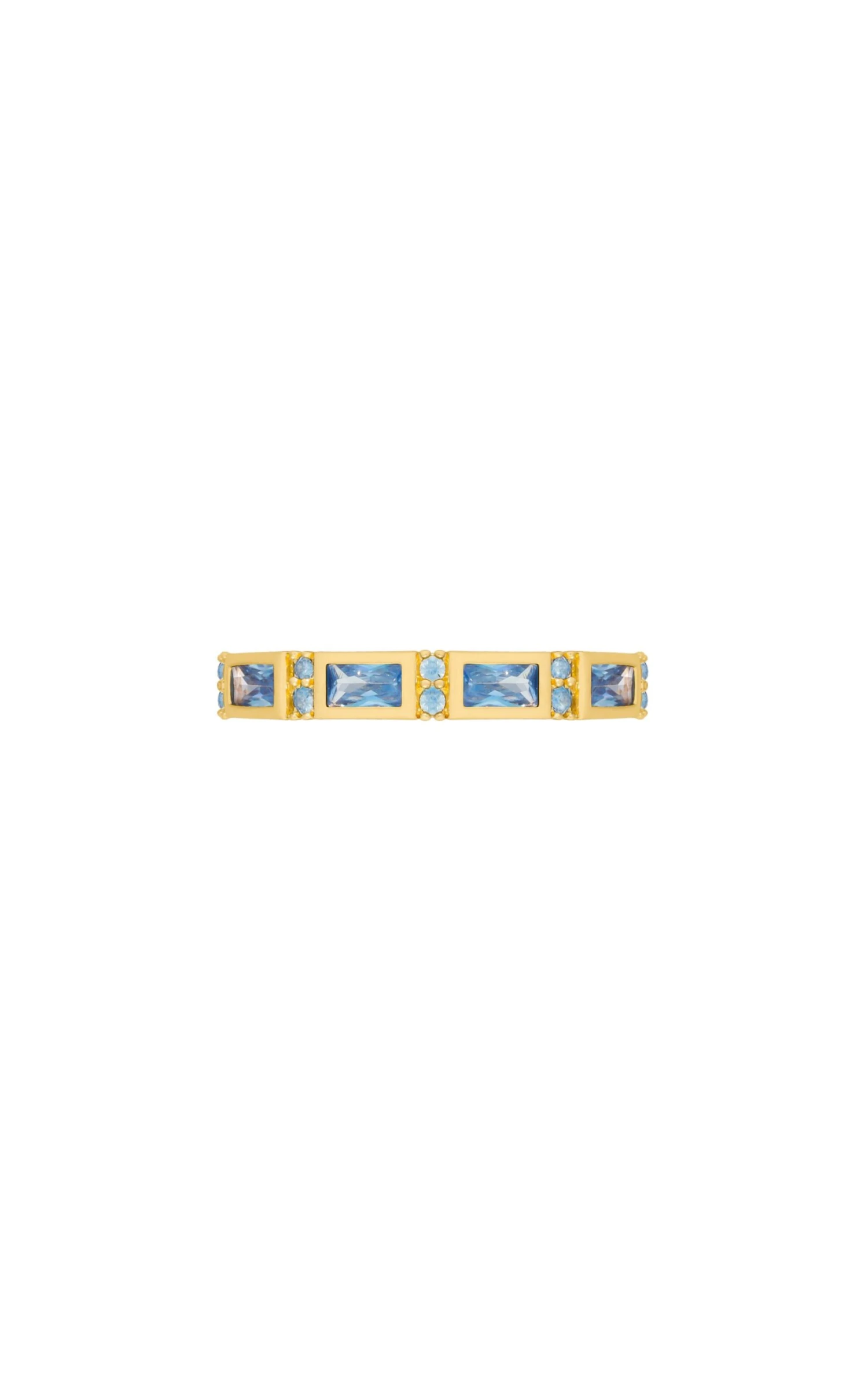 Sortez stylées, sortez strassées! On se pare à tous les doigts de nos bagues dorées aussi belles que des bonbons, que l’on décline à l’envi. Alliance revisitée, anneau élégant et intemporel, on adopte ces bagues pavées de strass forme baguette alternant avec des petits strass incrustés bleu effet saphir. Idéale pour briller jusqu’au bout des doigts!