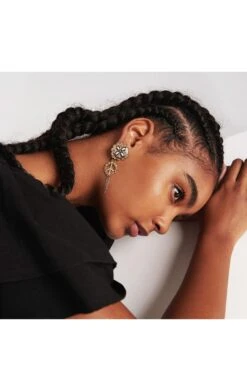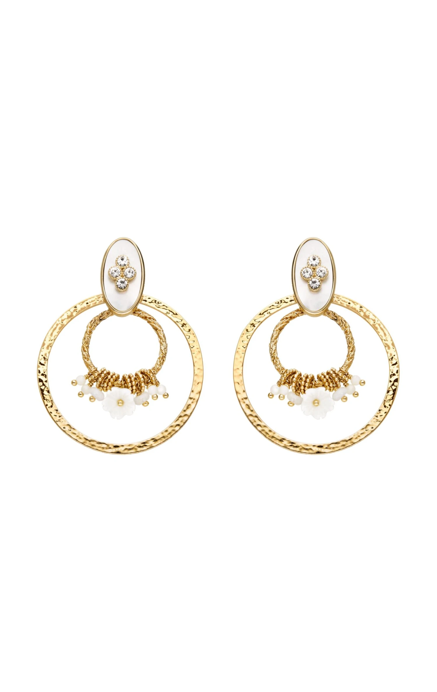 Boucles d’oreilles créoles dorées à l’or fin 14 carats sur tige pour oreilles percées. La tête de boucle ovale est ornée d’une pierre nacrée décorée de petits strass effet diamant, et tient deux anneaux martelés, dont l’un est ouvragé, orné de multiples petits anneaux à boules et perles en nacre, ainsi qu’une fleur nacrée. Le dernier anneau plus grand achève le look bohème chic de la créole XXL et haute en couleurs.