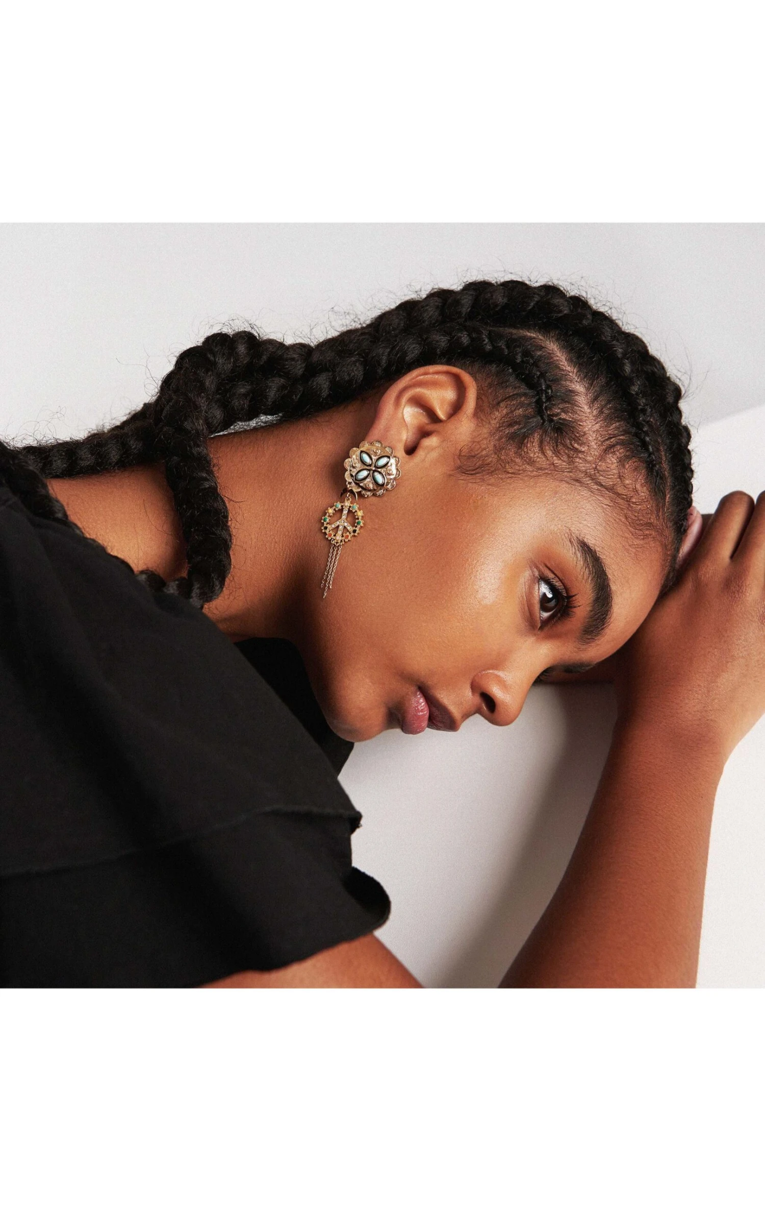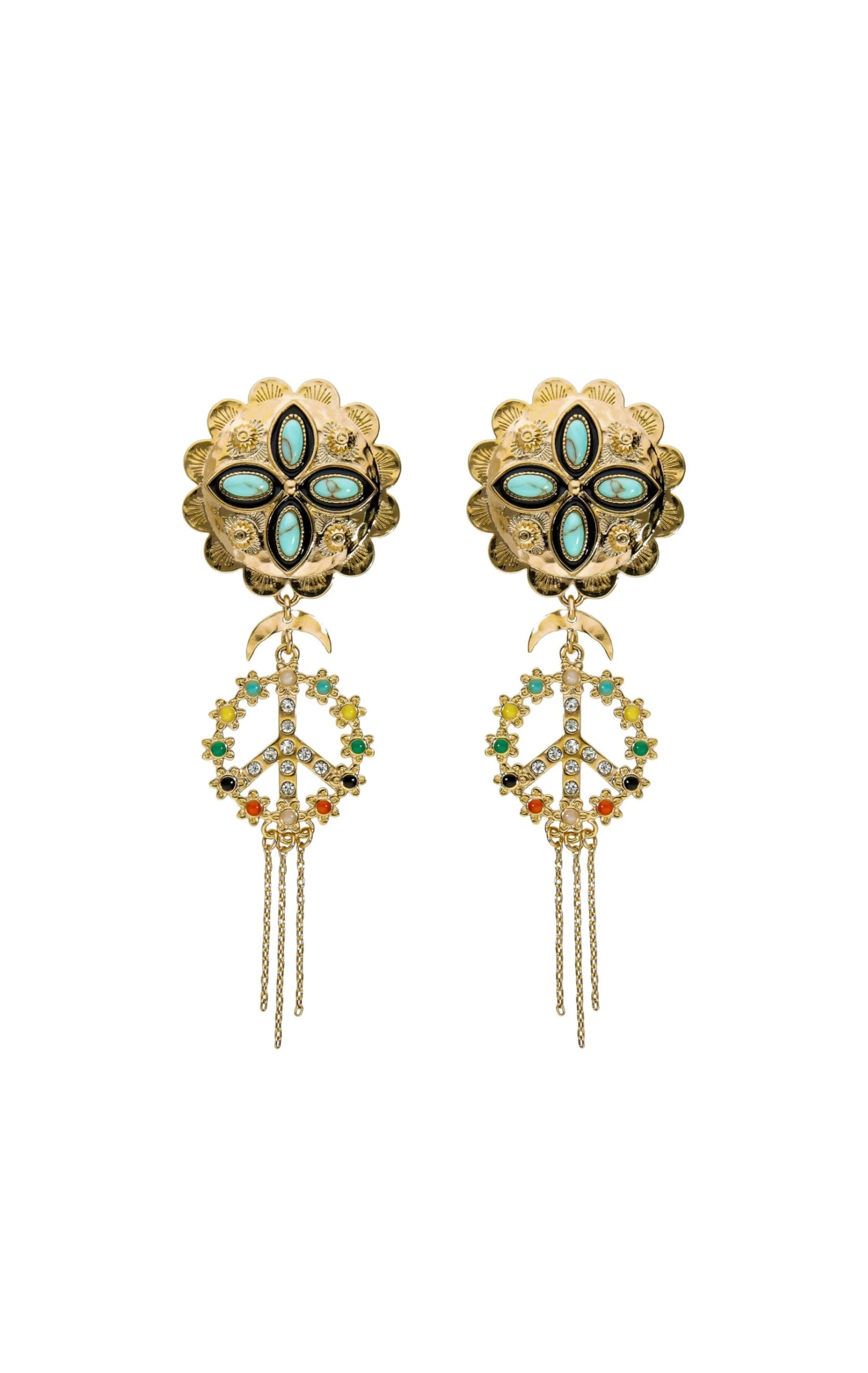 Osez le look retro baroque cet hiver! Ces boucles d’oreilles dorĂ©es Ă l’or fin 14 carats ont la particularitĂ© d’ĂŞtre montĂ©es sur clip pour oreilles non-percĂ©es. Elles sont dĂ©corĂ©es d’un cabochon solaire dĂ©corĂ© d’une fleur noir et turquoise qui rappelle le somptueux travail de la tribu des Zunis. On adore le style Navajo, revisitĂ© de manière baroque, qui rend cette collection atypique et fĂ©minine.