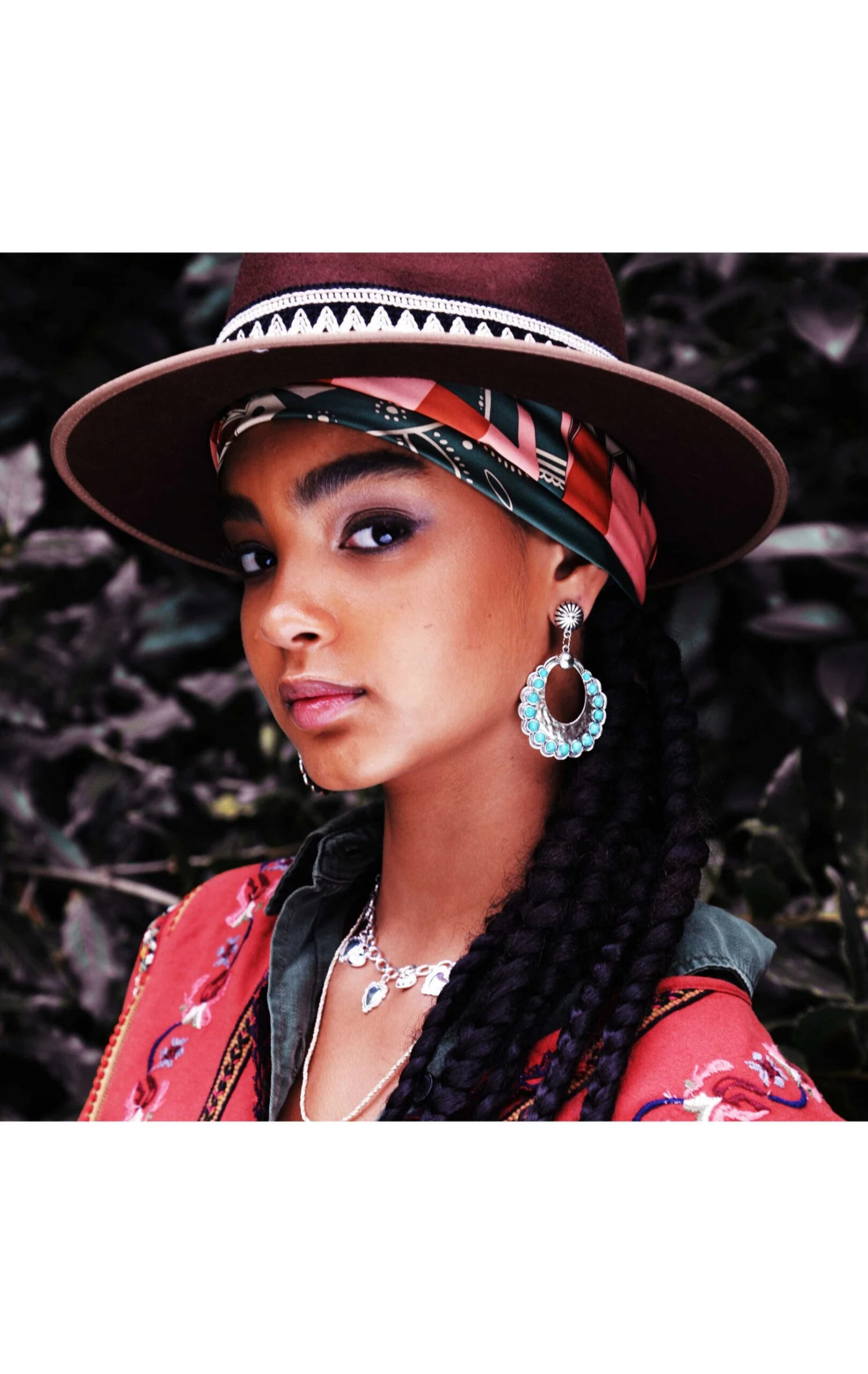 Boucles d’oreilles argentées pour oreilles percées, avec une tête de boucle en forme de coquillage, ouvrant sur une boucle style créole, martelée, avec une ouverture au centre. Très stylisées, elles sont ornées de petites gouttes de résine effet turquoise. Un look très Navajo pour ces boucles-d’oreilles faites à la main.