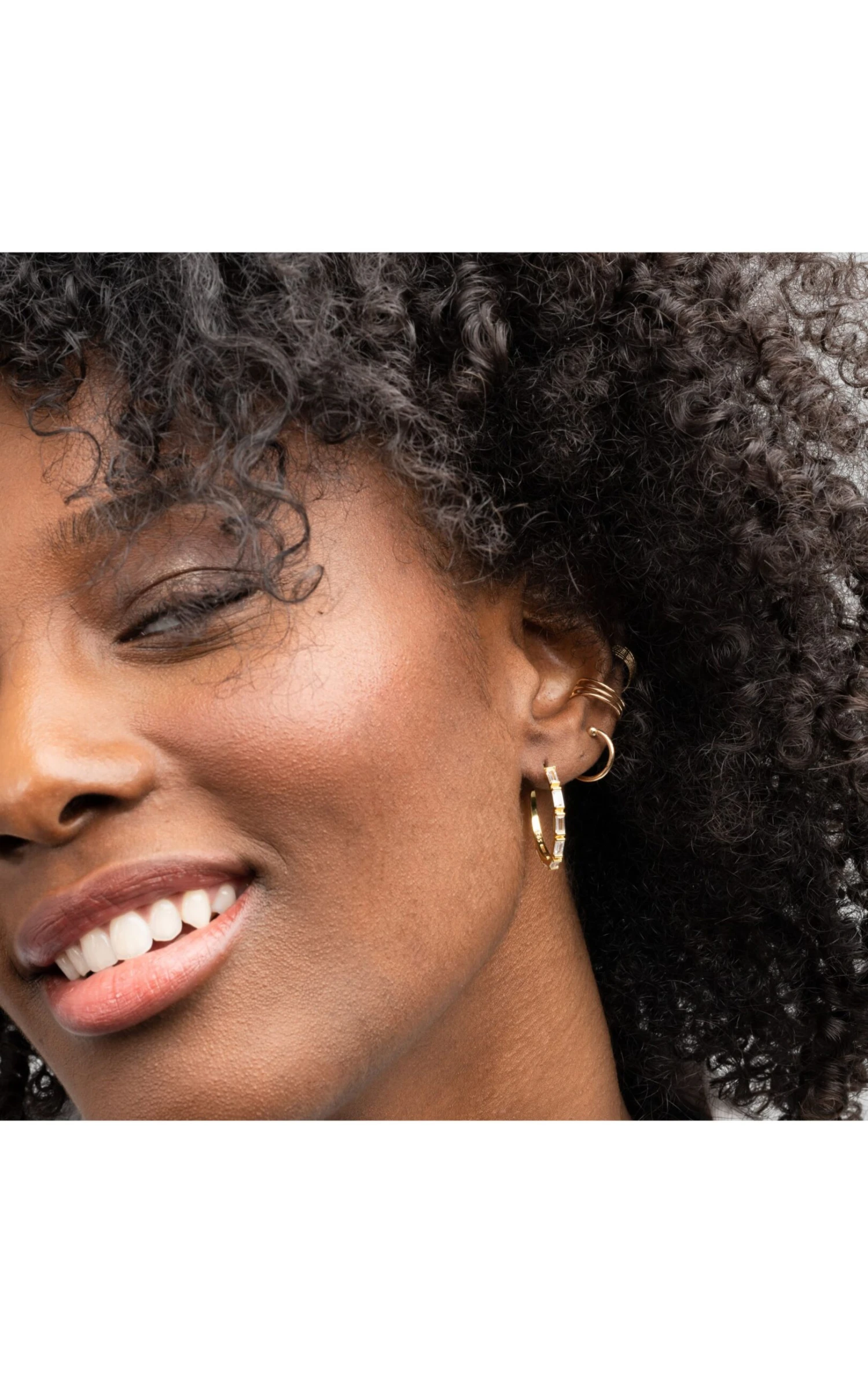 Boucles d’oreilles de forme crĂ©oles, taille medium. Elles sont ornĂ©es de pierres baguettes effet diamant, pour un effet rĂ©tro d’inspiration annĂ©es 1930 intemporel. DorĂ© Ă l’or fin 18 carats sur de argent 925 vĂ©ritable, ce bijou en vermeil vous est garanti sans risque d’allergie.