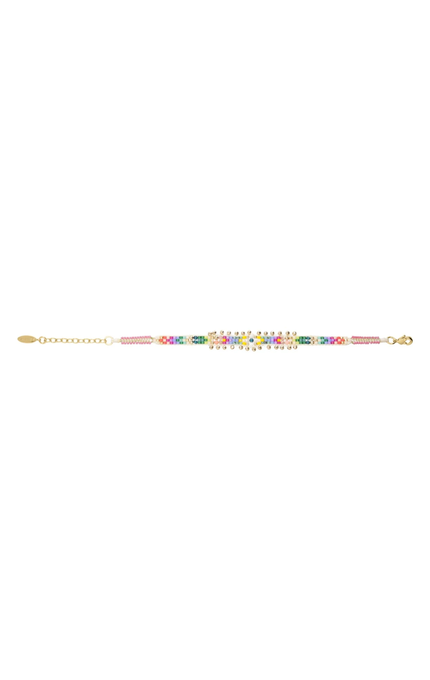 Bracelet tissé, avec un précieux montage de fermoir mousqueton, doré à l’or fin 18 carats. En son centre, on retrouve un motif tissé d’inspiration ethnique où se mêlent des perles Miyuki, dans des déclinaisons arc-en-ciel, de violet, bleu, rose, vert, à des perles facettées semi-précieuses en hématite et turquoise blanc, ainsi que de microscopiques perles en bout de bracelet. D’inspiration Navajo, Hipanema innove ici avec un tissage très élégant et original pour ce bracelet fait à la main.