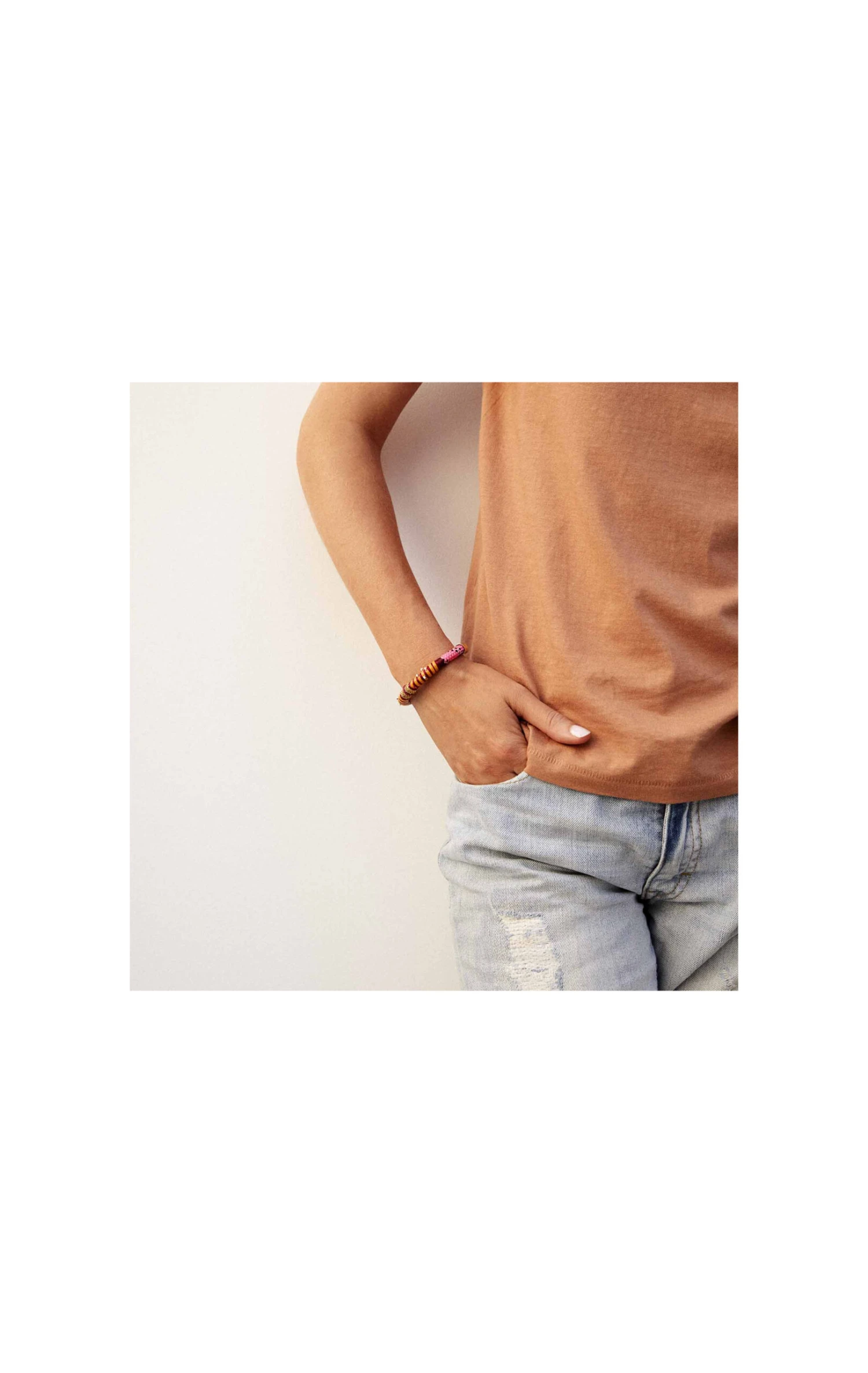 La combinaison prĂ©sentĂ©e ici est faite d’un lien « MARNY », bracelet-cordes de taille moyenne. MontĂ© sur une corde rose fluo et bleu indigo, il est dĂ©corĂ© de liens et de scoubidou bordeaux et jaune dorĂ©, ainsi que d’une chaĂ®ne dorĂ©e Ă l’or fin 14 carats au centre. Le fermoir Locket « BIGSTONE » est un grand fermoir mousqueton. Il est ici prĂ©sentĂ© en laiton plaquĂ© Ă l’or fin 14 carats et le pas de vis ornĂ© de cristaux rose effet rubis.