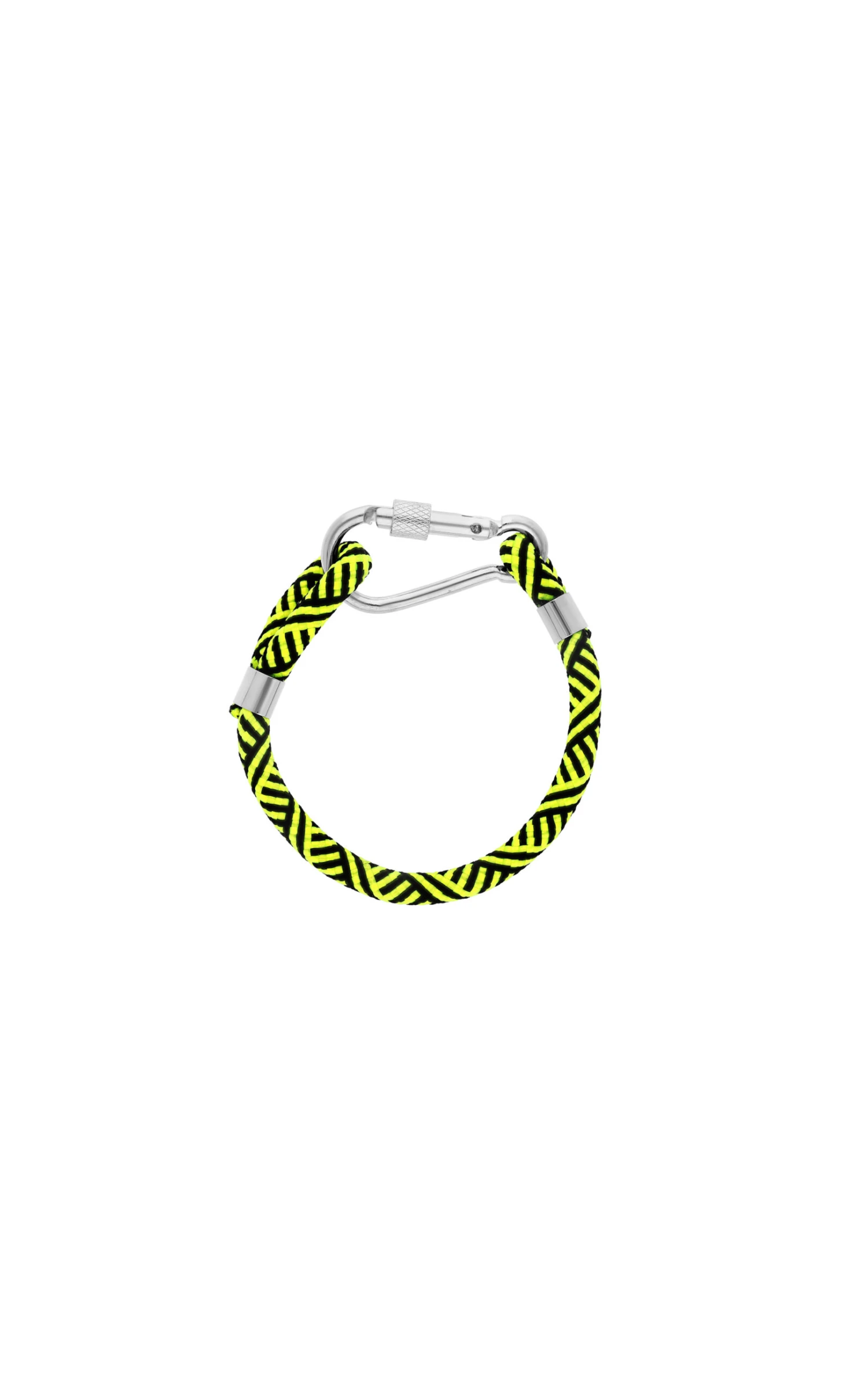 Bracelet homme composĂ© d’une corde noir et jaune fluo qui se ferme avec un fermoir mousqueton argentĂ©.