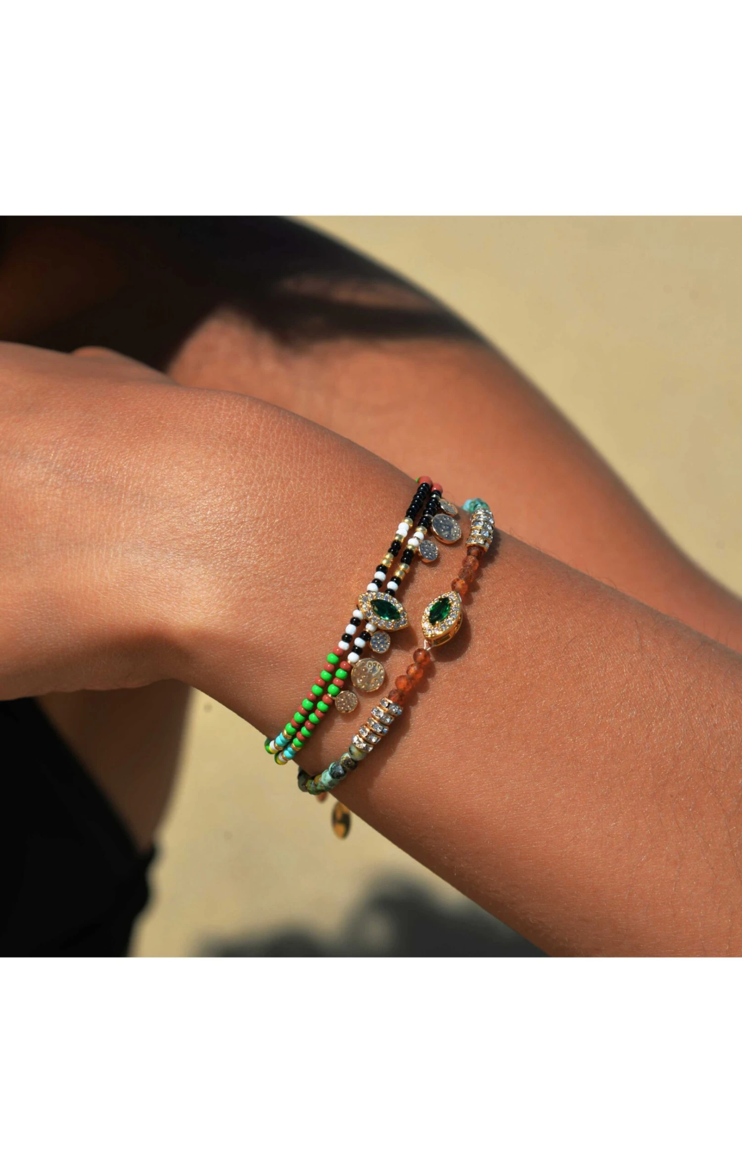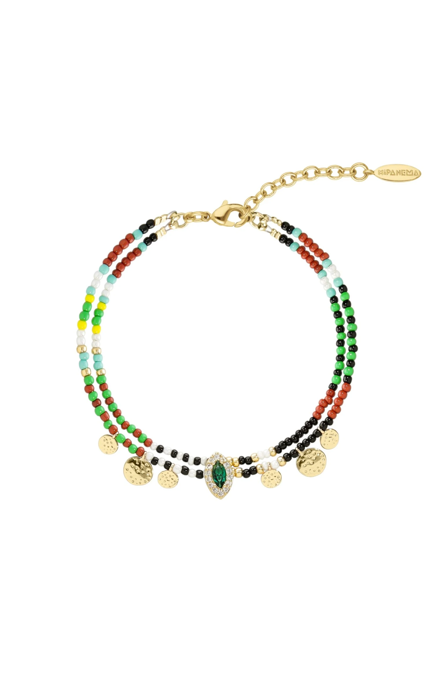 Coup de cœur garanti pour ce petit bracelet haut en couleurs! Il reprend tous les codes ethniques chics chers à Hipanema, avec son tissage en perles réalisé à la main, jouant sur un montage de perles en verre colorées, dans des tonalités de noir, café, vert, camel. Bracelet porte-bonheur, il se mue en objet précieux avec son cabochon central doré travaillé, orné d’une pierre vert olive effet smoky, entourée de pampilles sequins dorés. À porter seul ou en accumulation. Pour les petites et les grandes occasions.