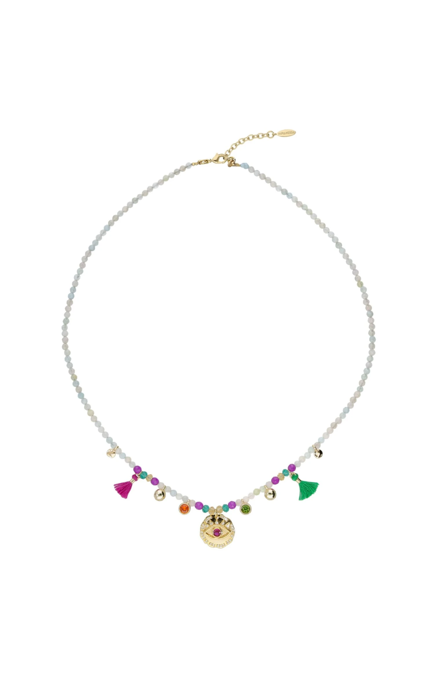 Cet hiver, vous aussi, craquez pour cette pièce prĂ©cieuse et colorĂ©e Ă l’esprit totalement bohème! Ce collier ras de cou dorĂ© Ă l’or fin 14 carats est entièrement constituĂ© de pierres semi-prĂ©cieuses dans les tons blanc, violet amĂ©thyste, vert Ă©meraude et ambre. Il est dĂ©corĂ© de petites pampilles multicolores avec en son centre une mĂ©daille reprĂ©sentant un Ĺ“il intĂ©gralement pavĂ©e de strass effet diamant et d’un strass central rouge effet rubis. Il est Ă©galement ornĂ© de deux petits pompons aux couleurs rose indien et vert, de deux petits grelots ainsi que de deux gouttes aux couleurs orange et vert.