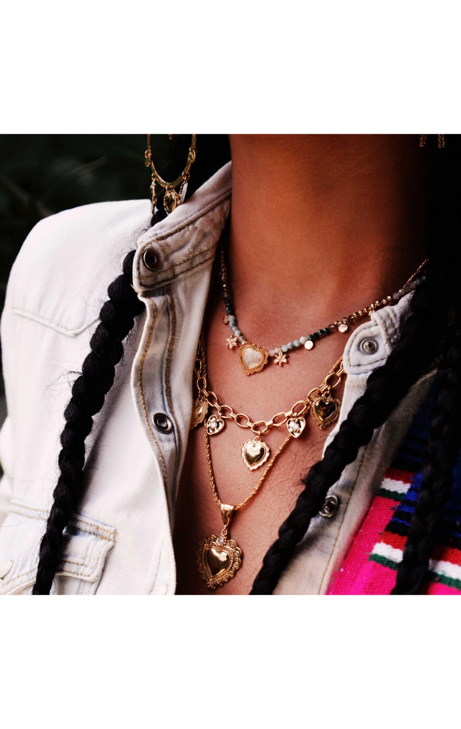 Collier ras de cou doré à l’or fin sur sur une chaîne au maillon jaseron rond et cossu, avec des pampilles effet breloques. On adore cet esprit Navajo, Nouveau-Mexique, fil rouge de notre collection. En son centre, trois cœurs dorés travaillés de façon ex-voto, sont entourés de petits cœurs en breloques, ornés de petits strass effet diamant. Ce bijou est fait à la main.