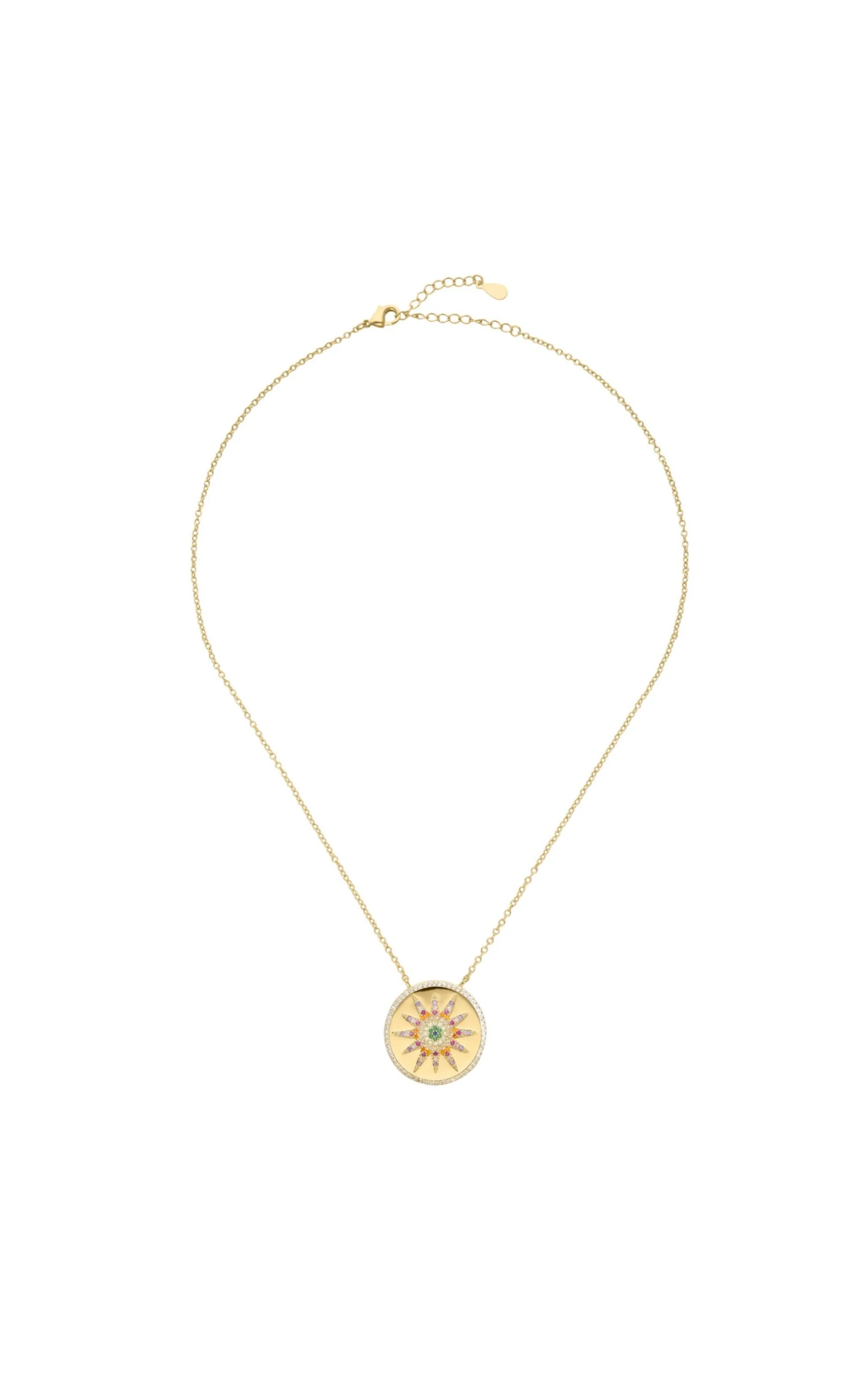 Collier ras de cou dorĂ© Ă l’or fin, composĂ© d’un mĂ©daillon effet soleil multicouleurs avec pierres violet effet amĂ©thyste, rouge effet rubis, vert effet Ă©meraude. Pavage de strass tout autour, moulĂ© sur une chaĂ®ne forçat. Le collier parfait pour l’Ă©tĂ©, avec son mĂ©daillon effet pentacle, très solaire, pour un rendu joaillerie bohème d’inspiration Ibiza.
