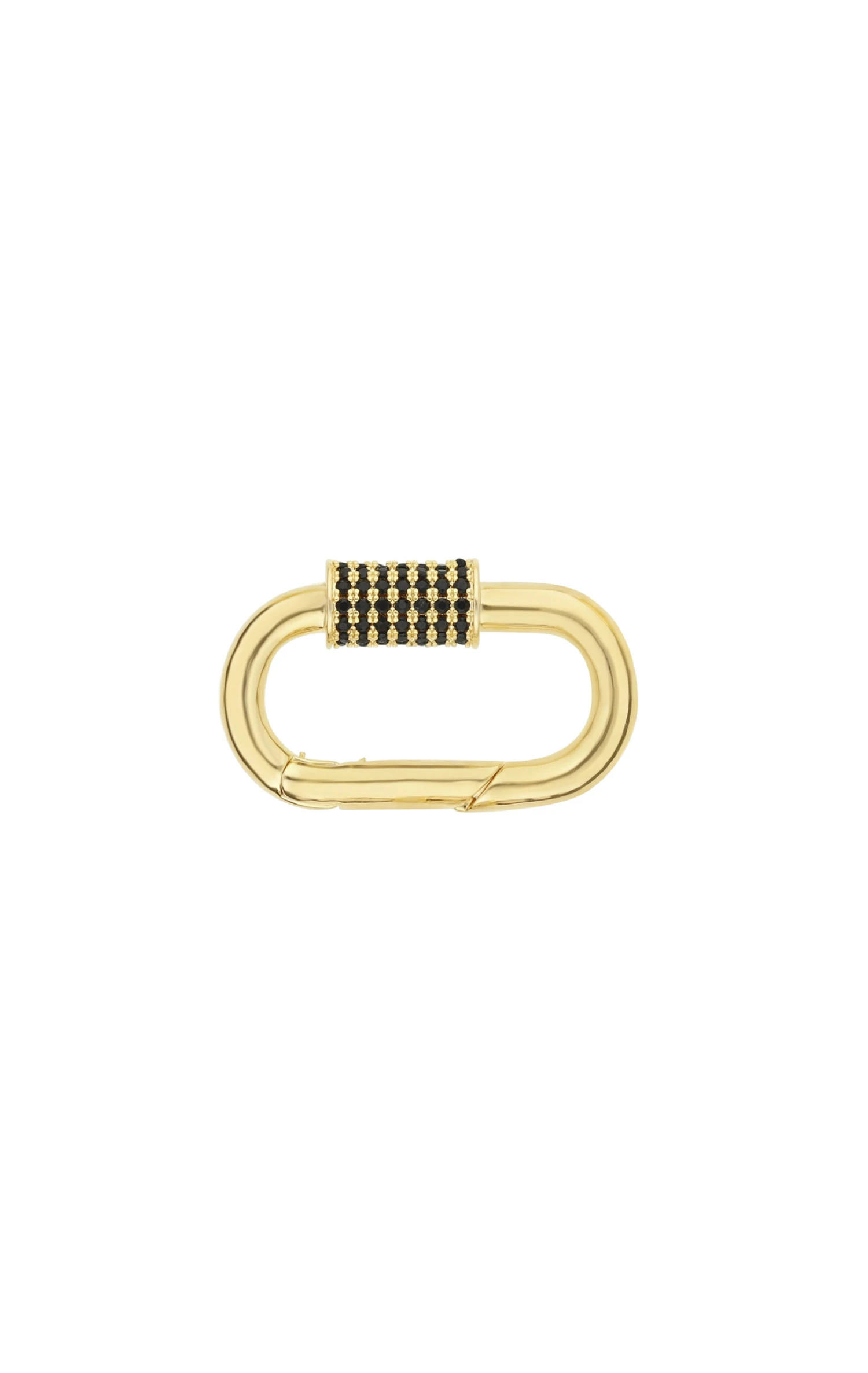 Le LOCKETS « BIG » est un grand fermoir mousqueton. Il est ici prĂ©sentĂ© en laiton plaquĂ© Ă l’or fin 14 carats et le pas de vis ornĂ© de cristaux noirs effet diamant noir.