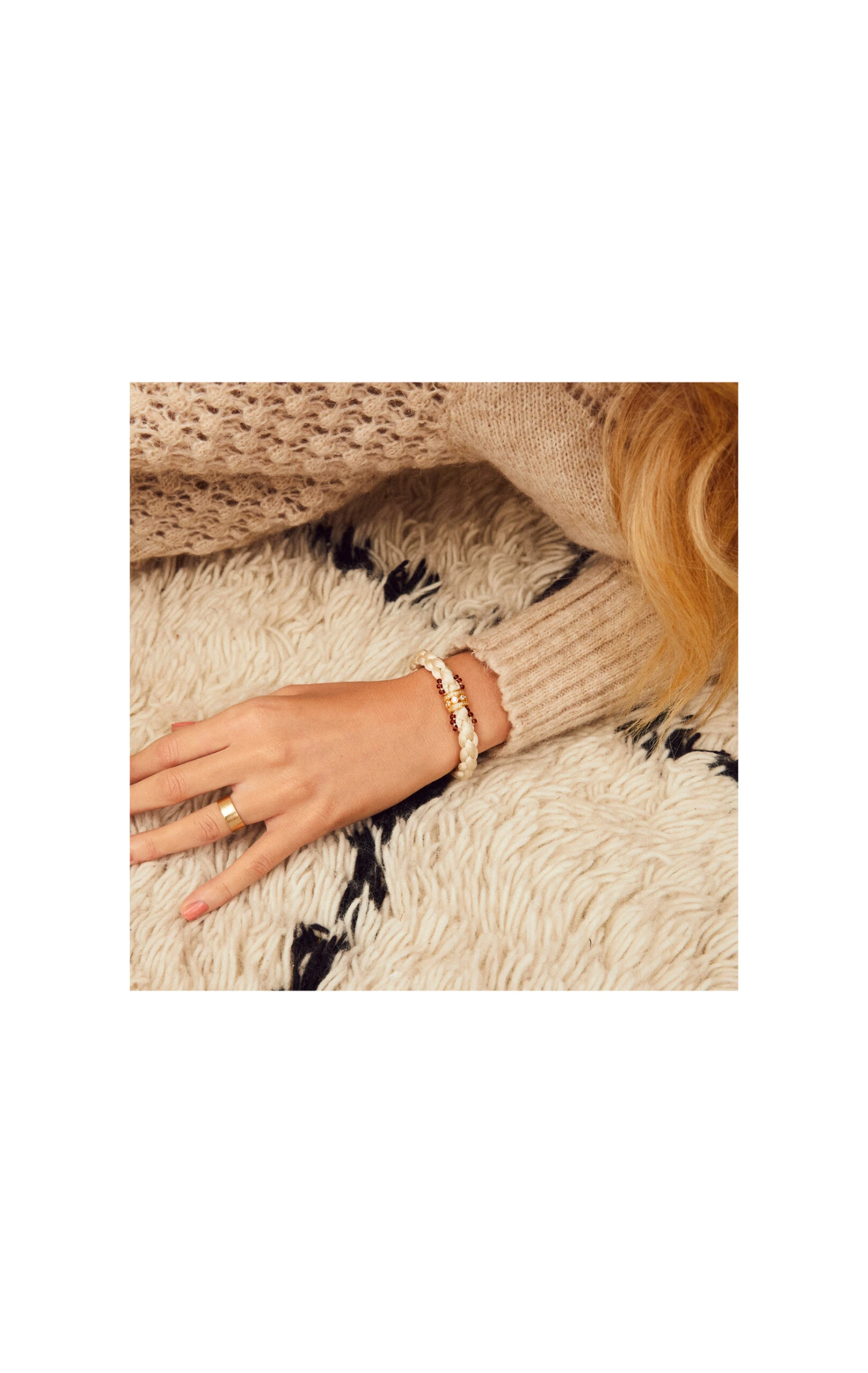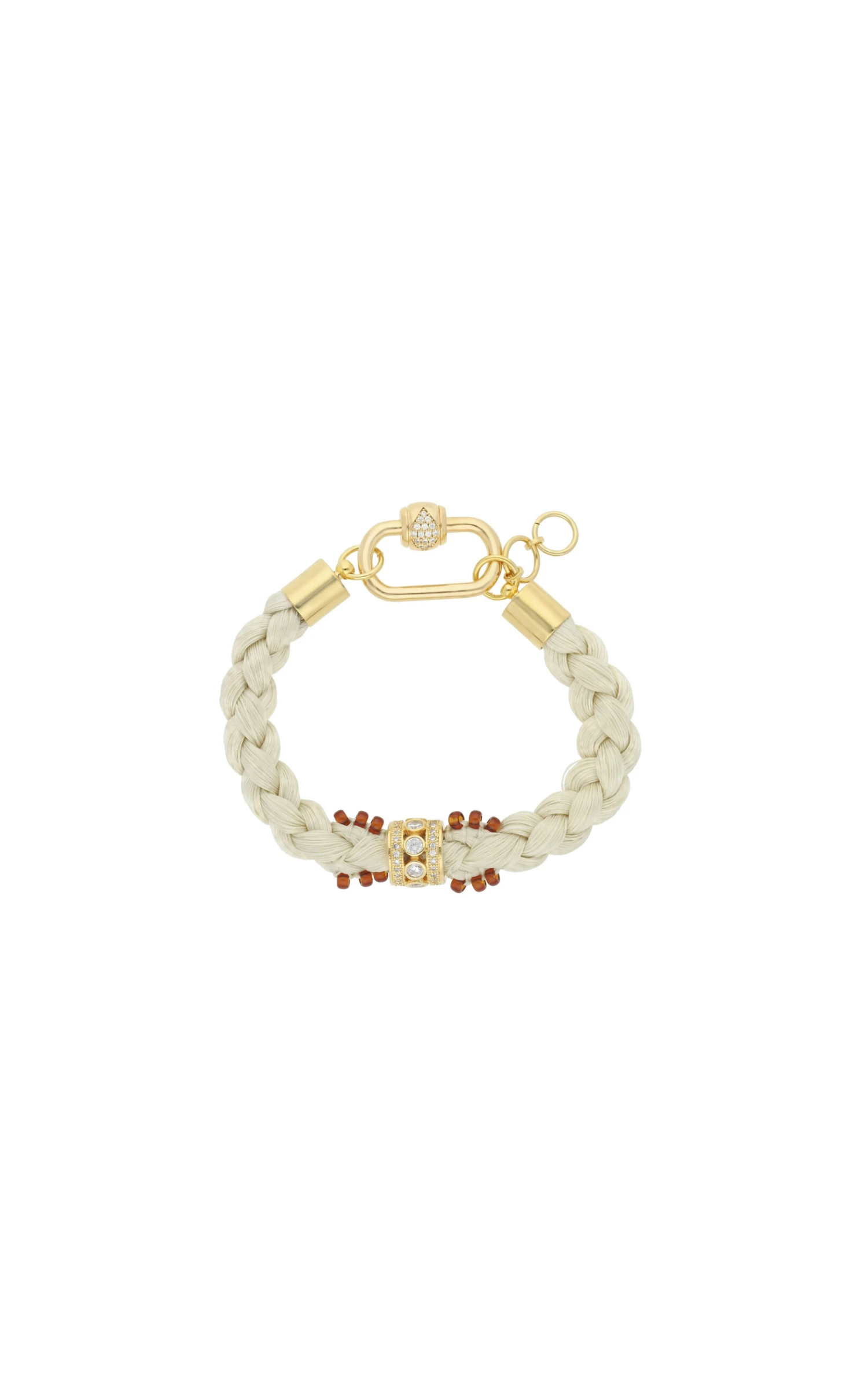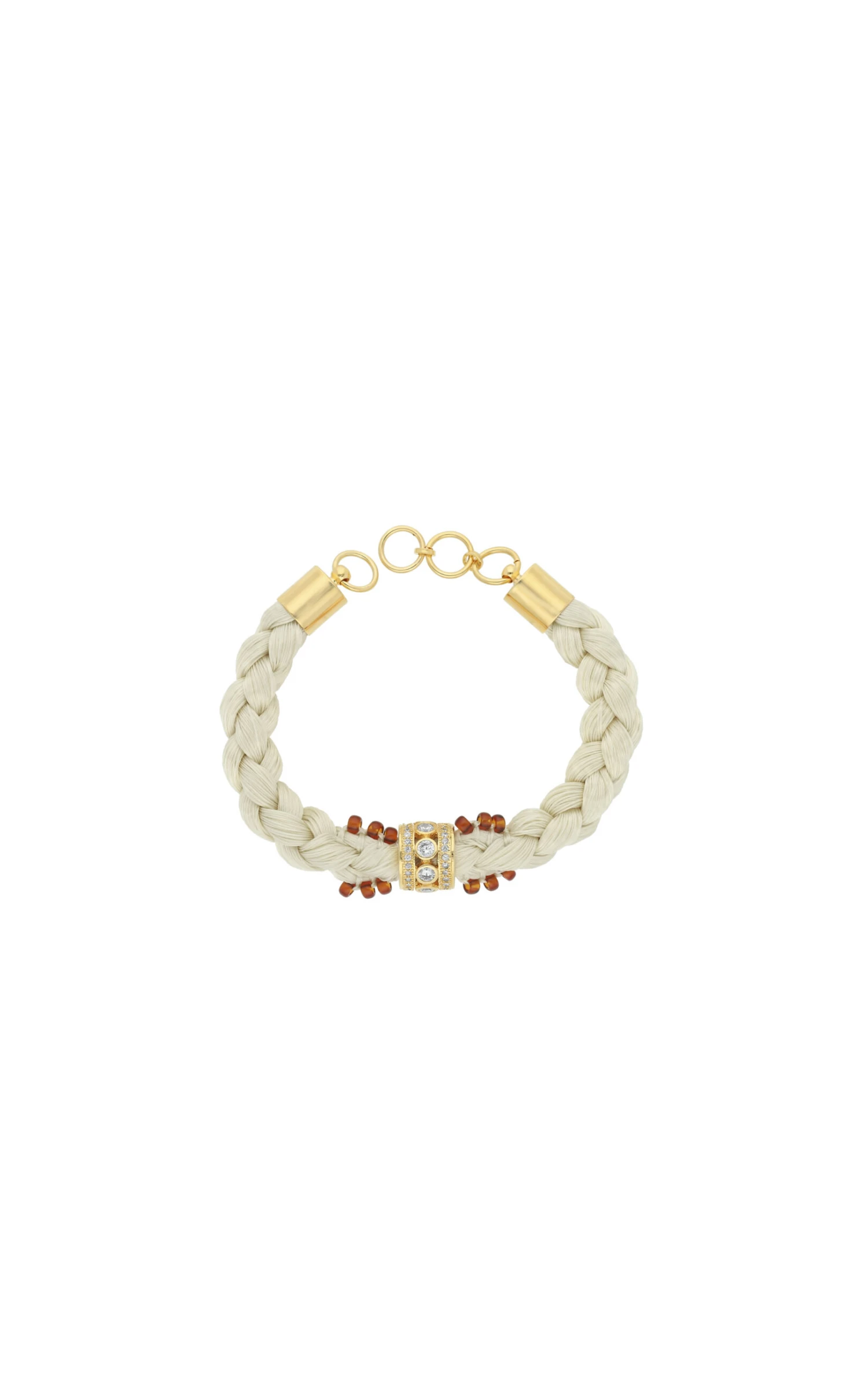 Lien dorĂ© Ă l’or fin 14 carats composĂ© d’une large tresse de fil blanc cassĂ© avec en son centre un anneau dorĂ©, pavĂ© de trass effet diamant et emmanchĂ© sur la tresse. La tresse est ornĂ©e de douze petites perles de couleur ambre cousues. Ă€ associer avec les fermoirs « LOCKETS ».