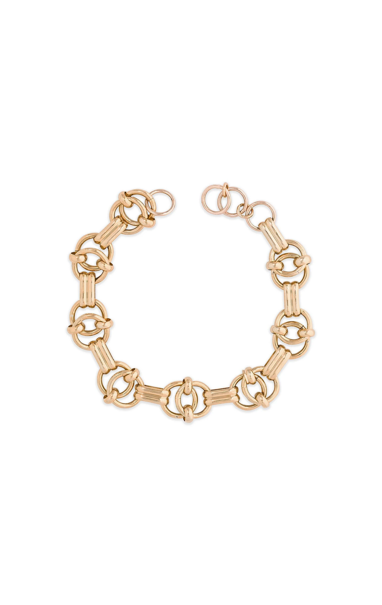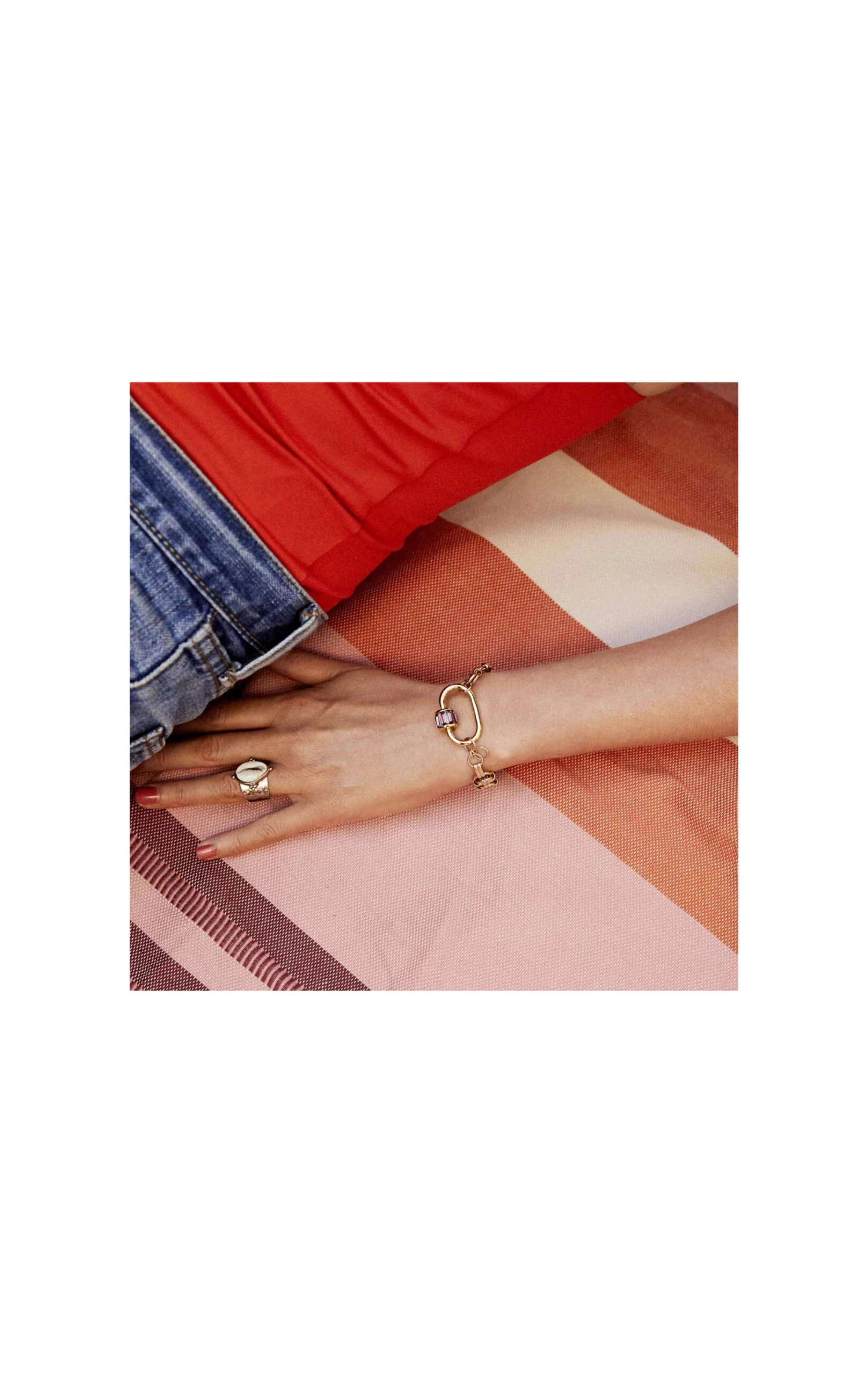 Les bracelets CLARE sont les liens en chaĂ®ne. Ici vous est prĂ©sentĂ© une chaĂ®ne fantaisie Ă©paisse de maille double cercle rattachĂ©e avec double anneau dorĂ©e Ă l’or fin 14 carats.