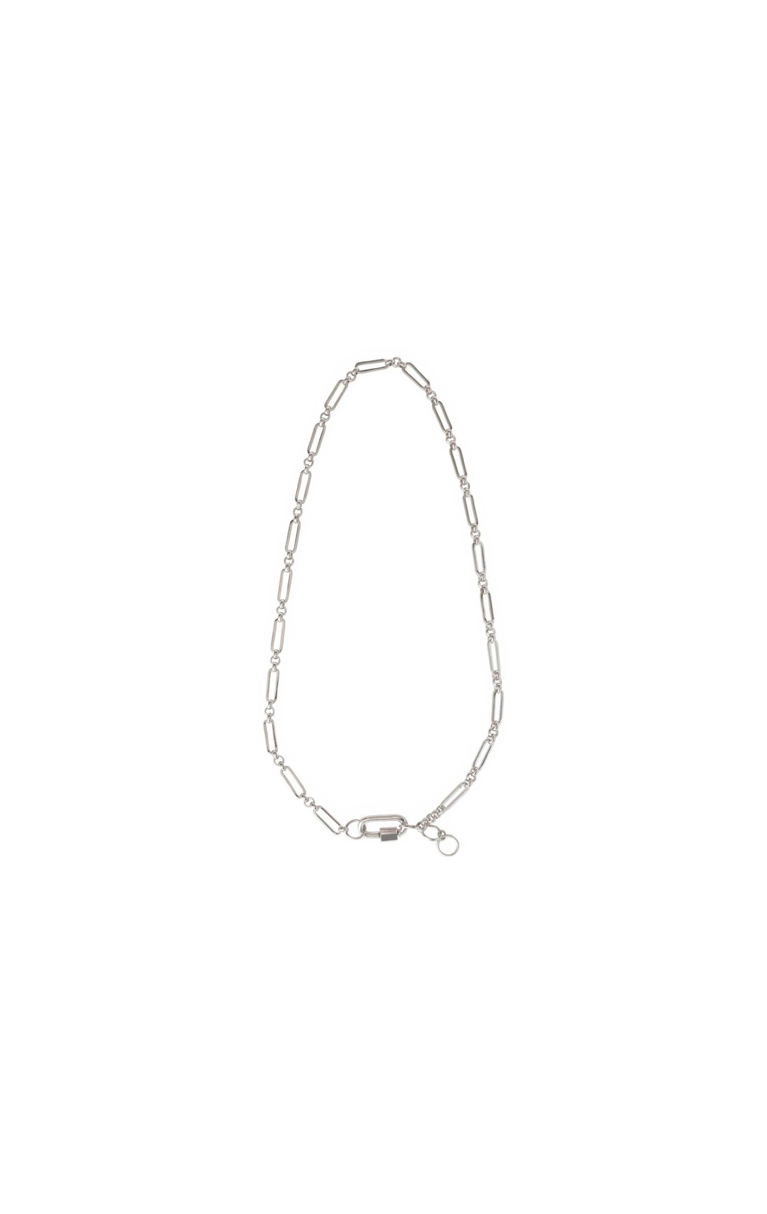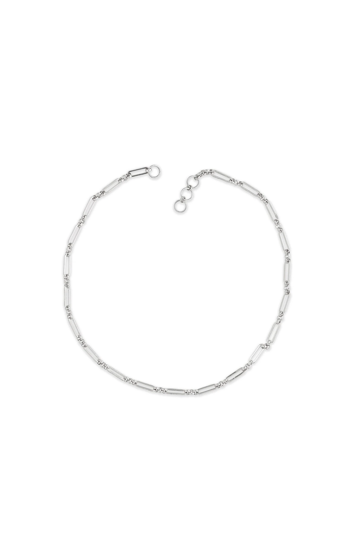 Les colliers « CRUSOE » sont les liens en chaîne ras du cou. Ici vous est présenté une chaîne fine de maille rectangle intercalée de trois petits anneaux, argentée au rhodium. Fermoir non inclus, il faudra compléter votre commande avec un Locket.