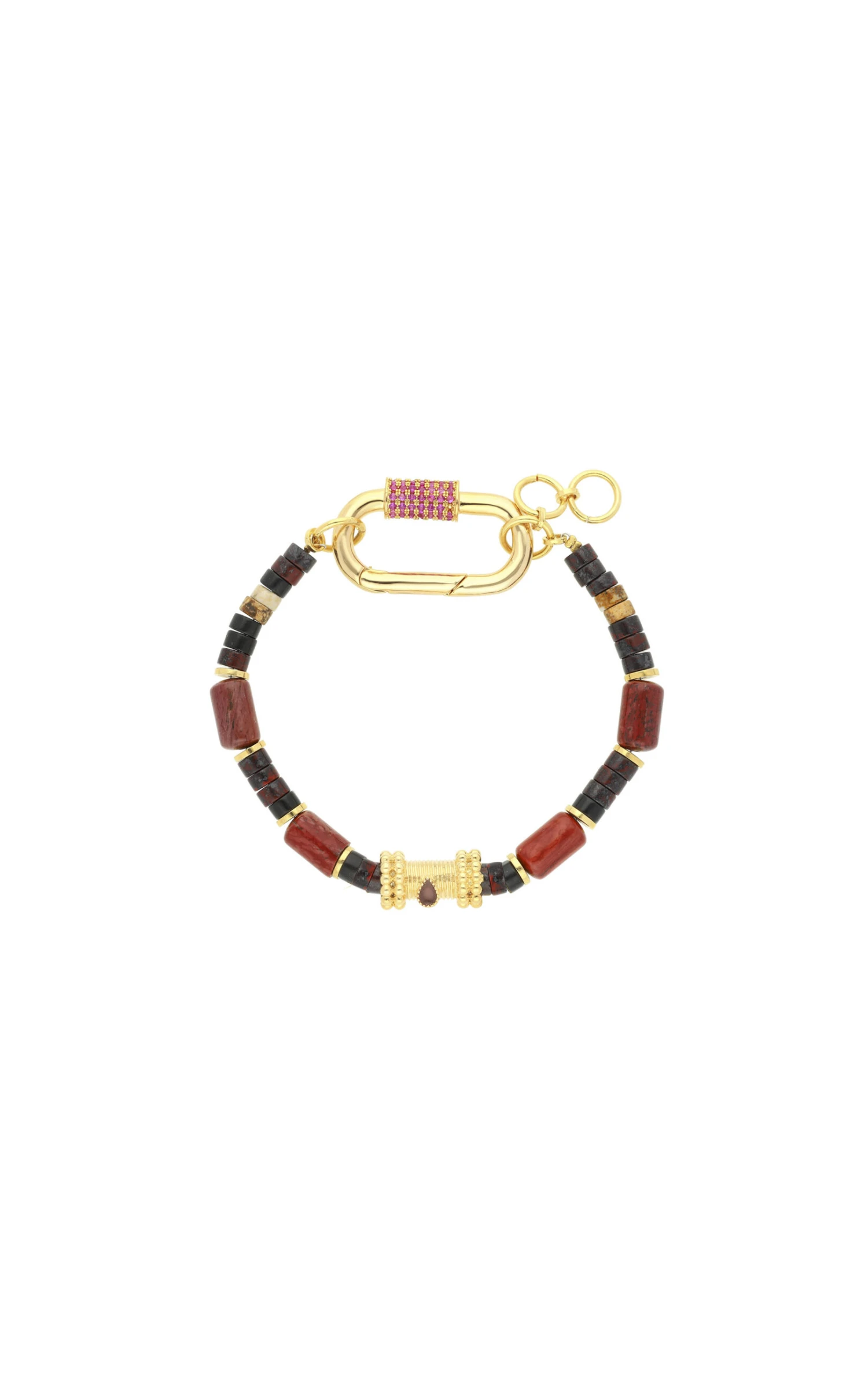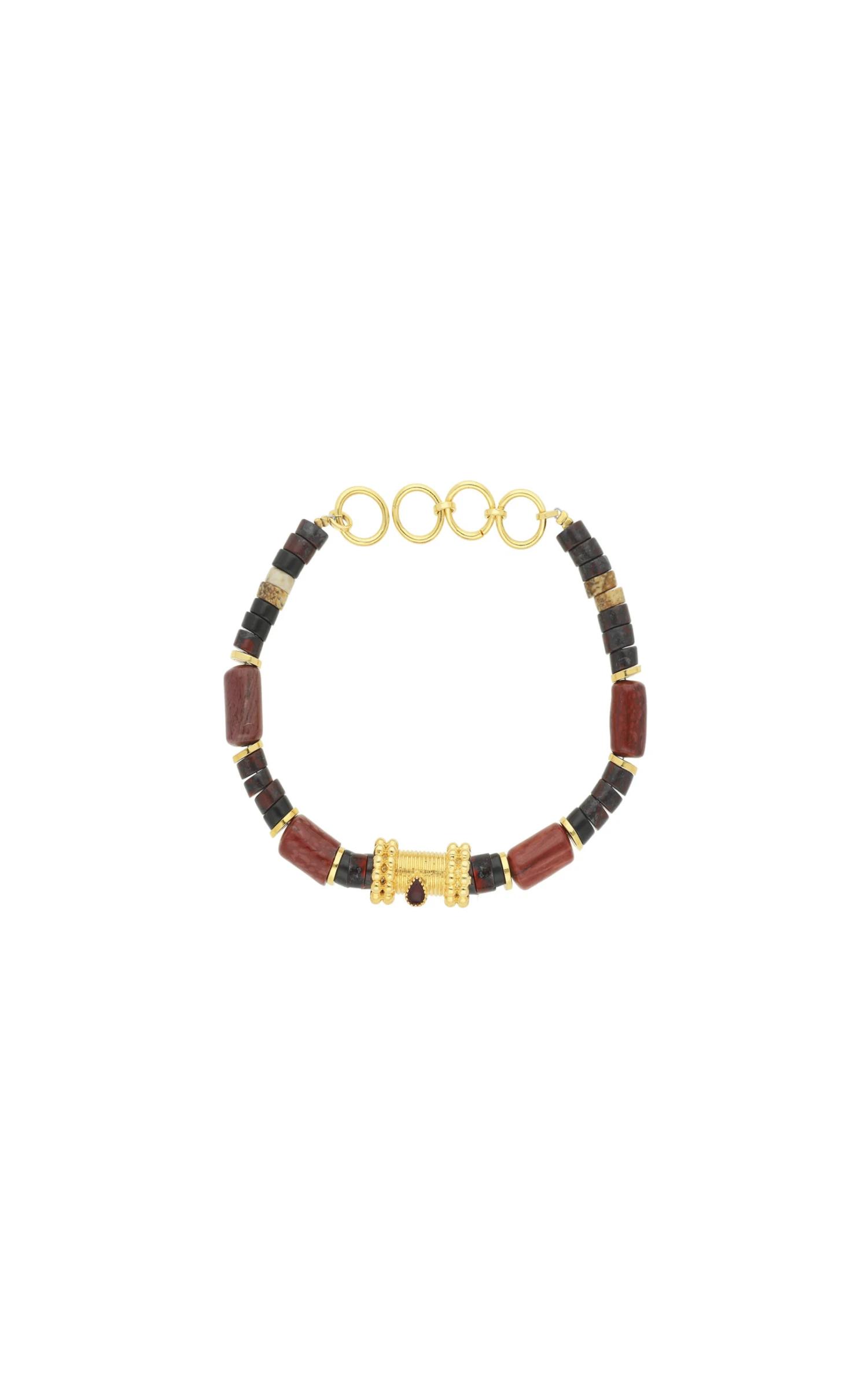 Ce lien dorĂ© est composĂ© de pierres semi-prĂ©cieuses vĂ©ritables en jaspe rouge, agate et oeil de tigre. Le cabochon central est ornĂ© d’une goutte rouge effet grenat. Ă€ associer avec les fermoirs « LOCKETS ».