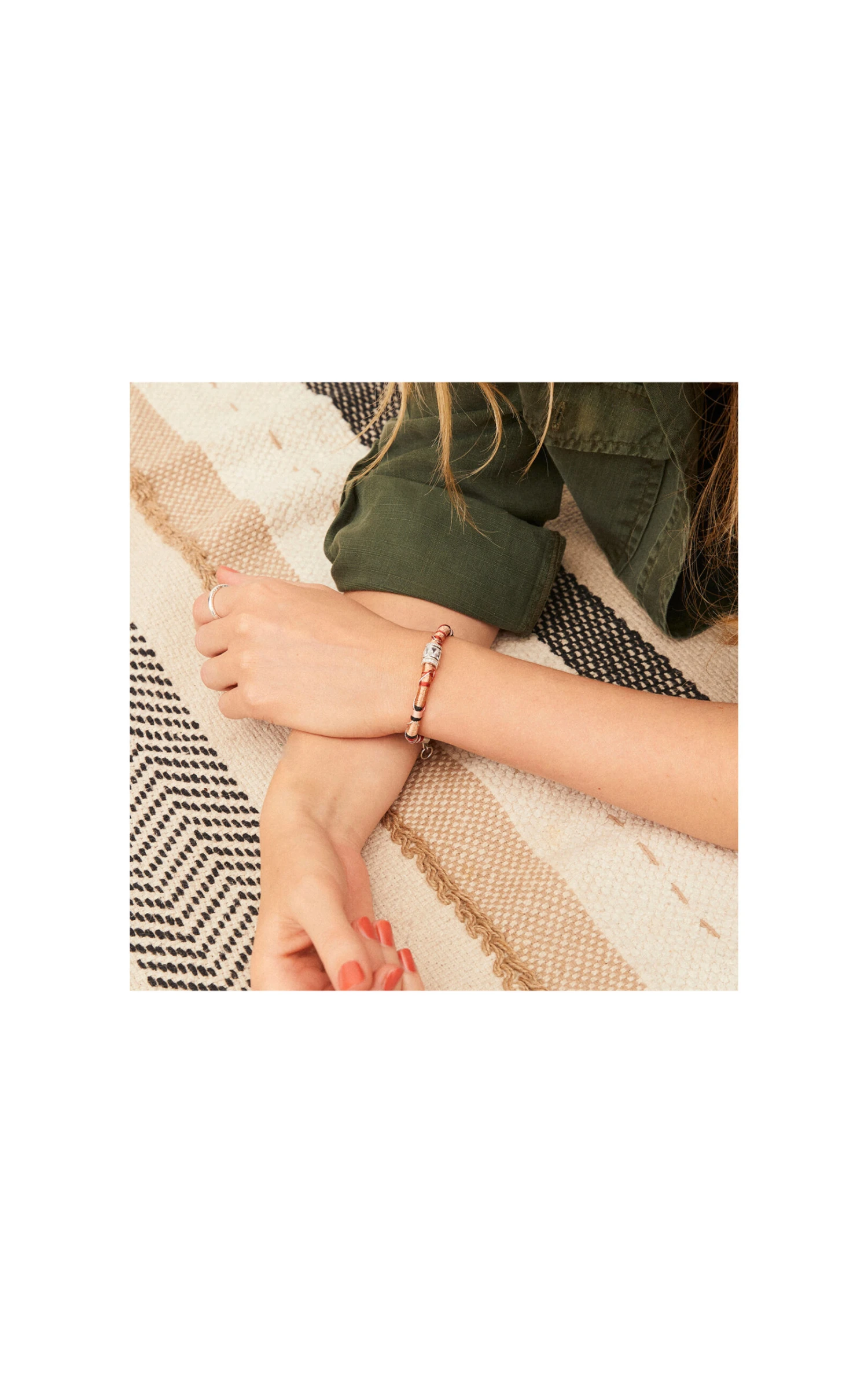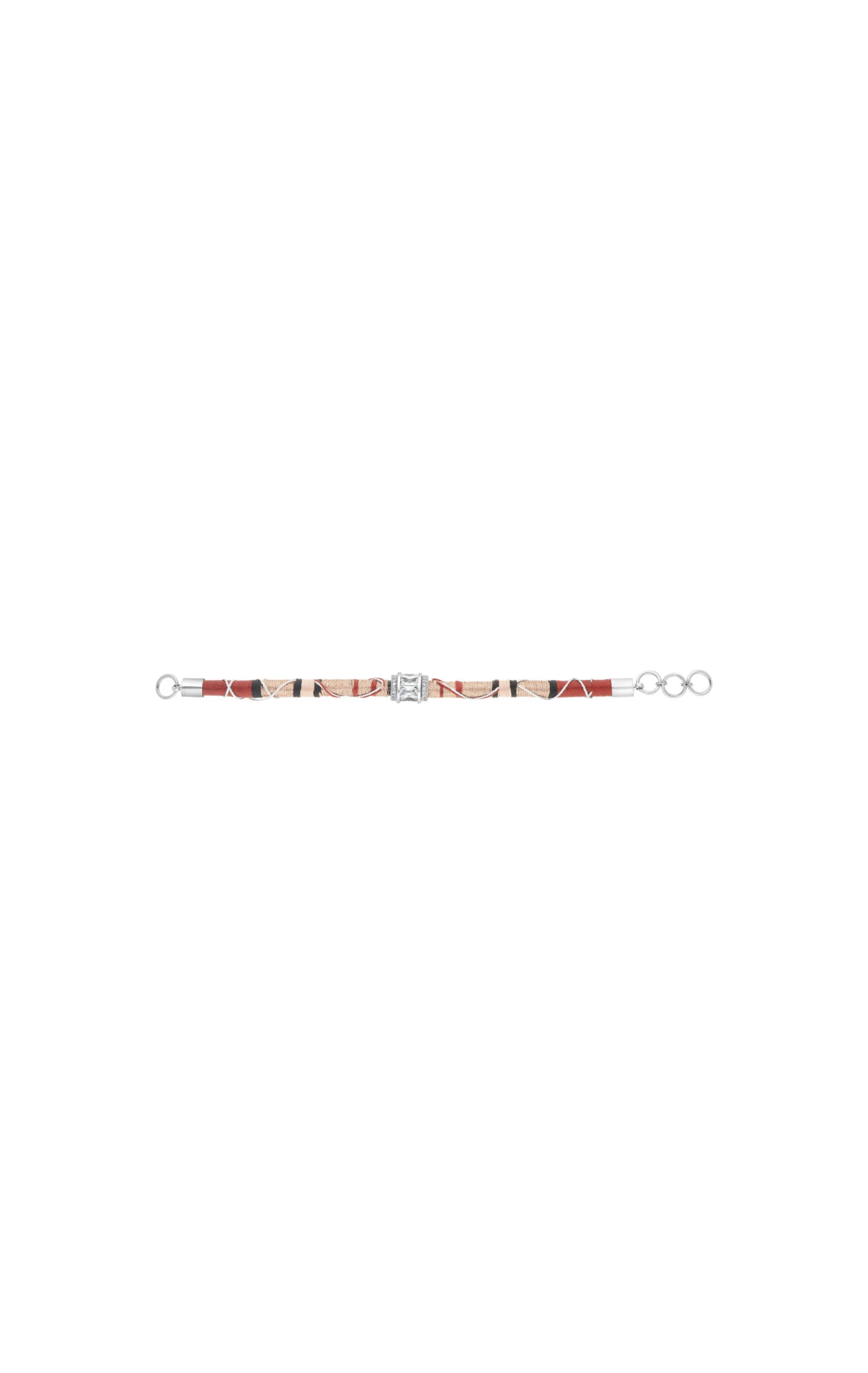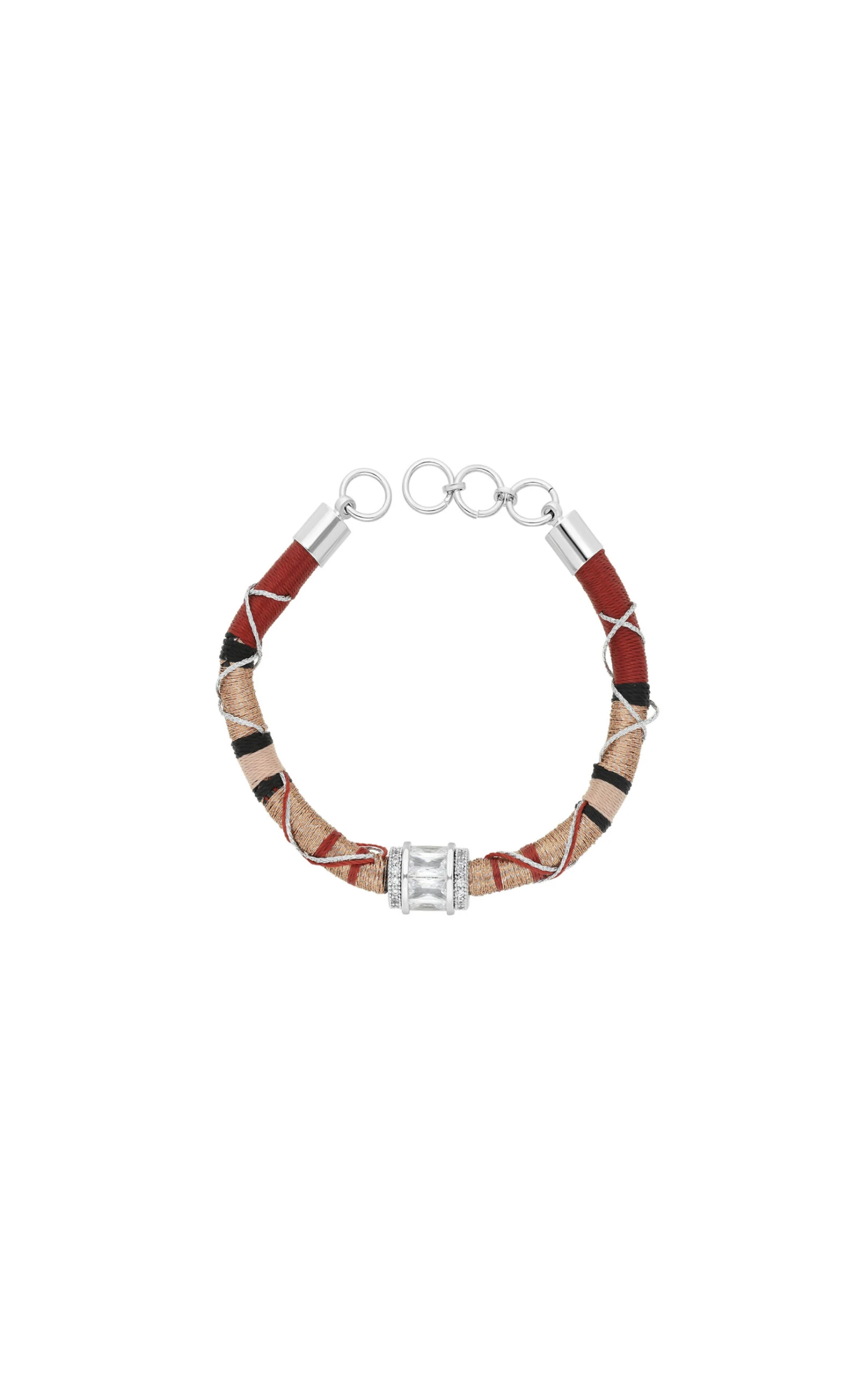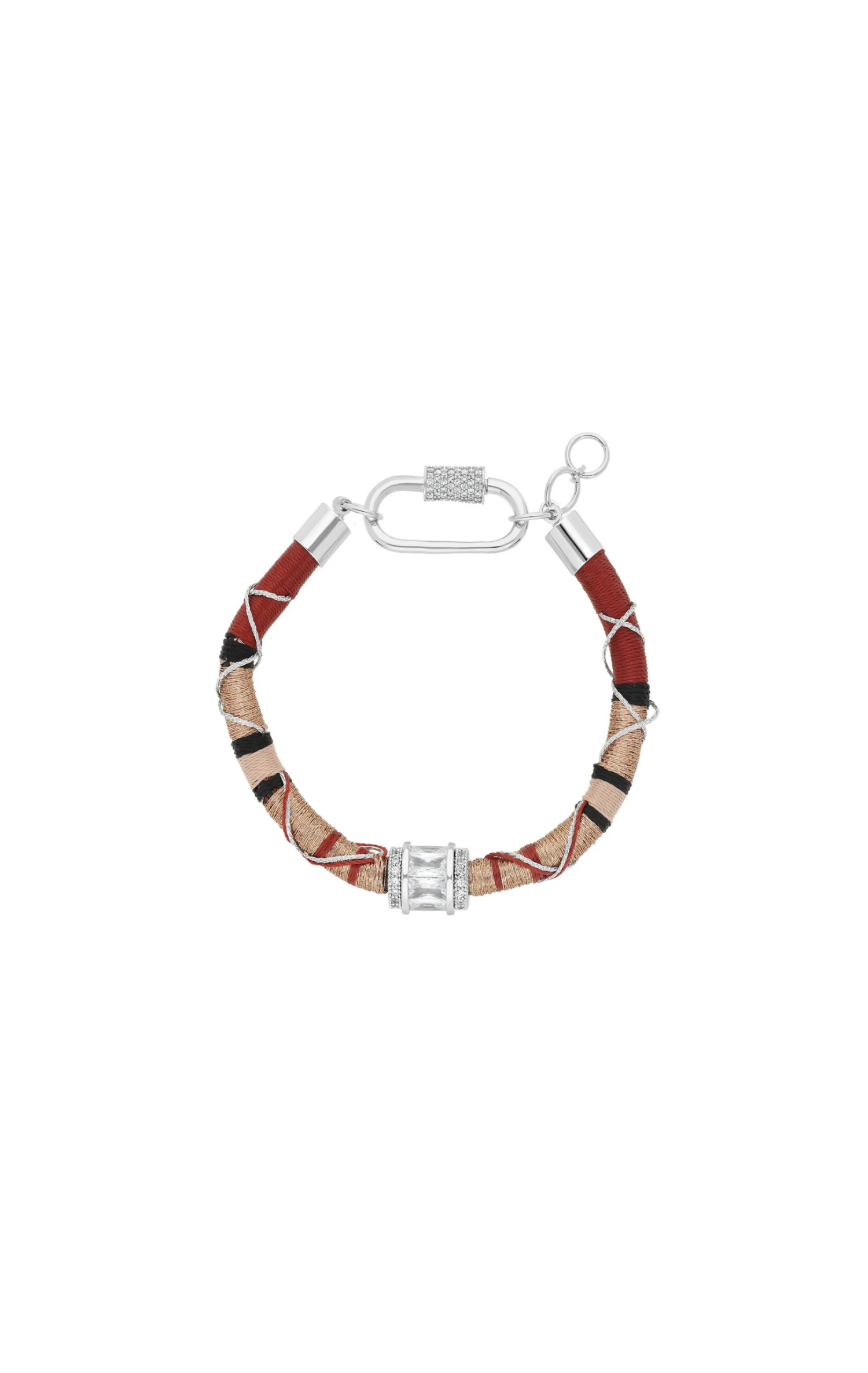 Lien argentĂ© tricolore tissĂ© de fils rouille, nude, rose pâle, noir et argentĂ©. Il est ornĂ© d’une pampille centrale argentĂ©e, pavĂ©e de cristaux effet diamant. Ă€ associer avec les fermoirs « LOCKETS ».