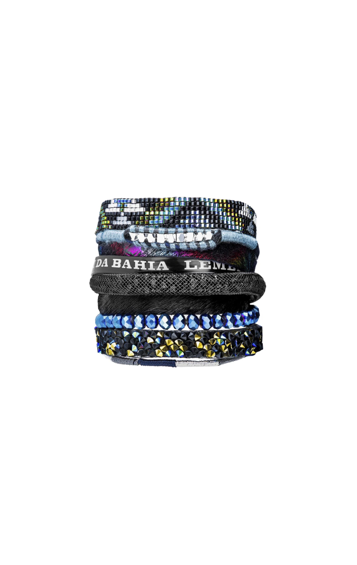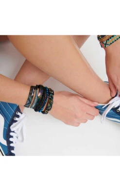 Cette large manchette avec un fermoir aimanté argenté est composée de multiples liens brésiliens et en perles du japon tressées. Une composition originale si chère à Hipanema dans les tons noir et bleu foncé.