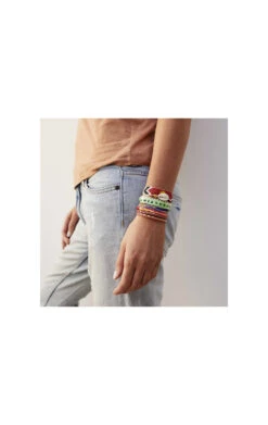 Petite manchette fine composée de quatre liens, au fermoir aimanté, et aux chaînes et pampilles dorées à l’or fin 18 carats. On découvre ainsi une petite chaîne chapelet dans des tons dorés avec des perles semi-précieuse multicolores, puis un lien tissé au tissage atypique en son centre, mêlant perles de rocaille multicolores et pierres semi-précieuses hématite, corail, turquoise, grenat, turquoise blanc, obsidienne, suivi d’une chaîne forçat fine intercalée de perles de verre en tubes, ainsi qu’une petite chaîne forçat sur laquelle sont brodées de petites marguerites en perles facettées de verre, dans des tons jaune, rose clair, fuchsia, bleu marine, turquoise, Bleu Klein. La manchette parfaite, et faite à la main, pour faire vibrer l’été à votre poignet.