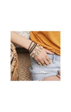 Splendide manchette multi-liens ornĂ©e de ravissants coquillages cauri et munie d’un fermoir dorĂ© aimantĂ©. Ce bracelet est composĂ© de chaĂ®nes dorĂ©es Ă l’or fin 14 carats, de perles tressĂ©es noires.