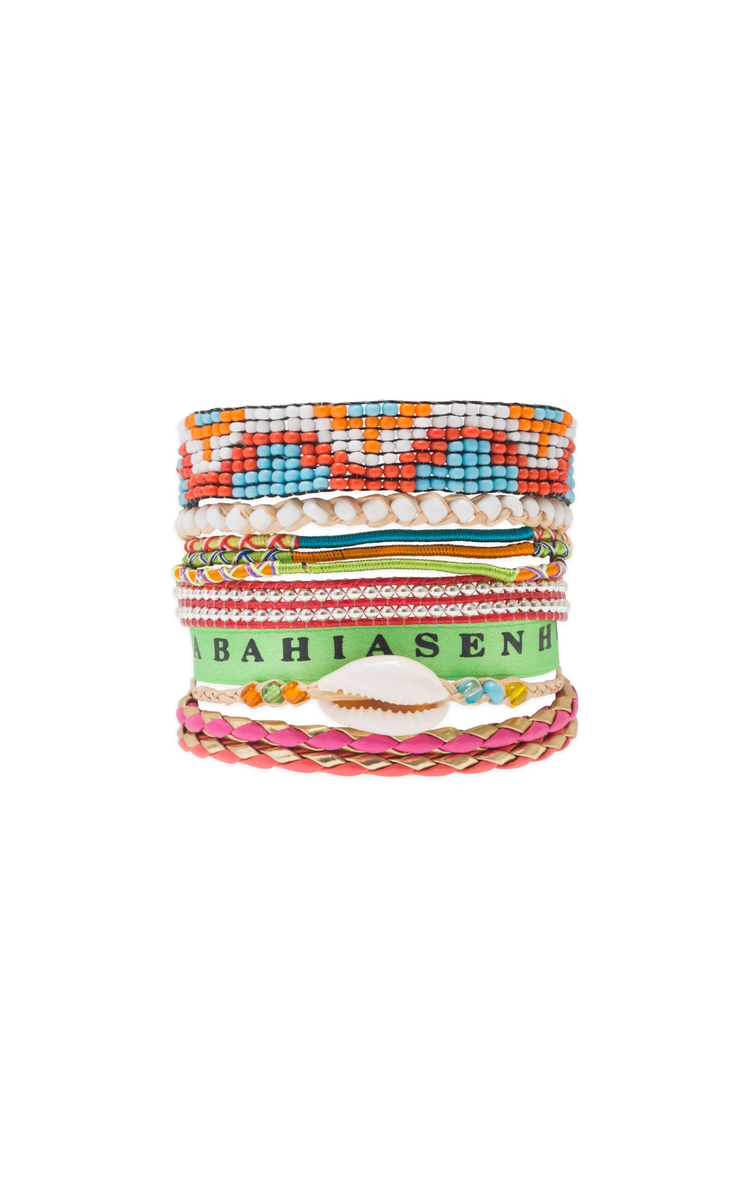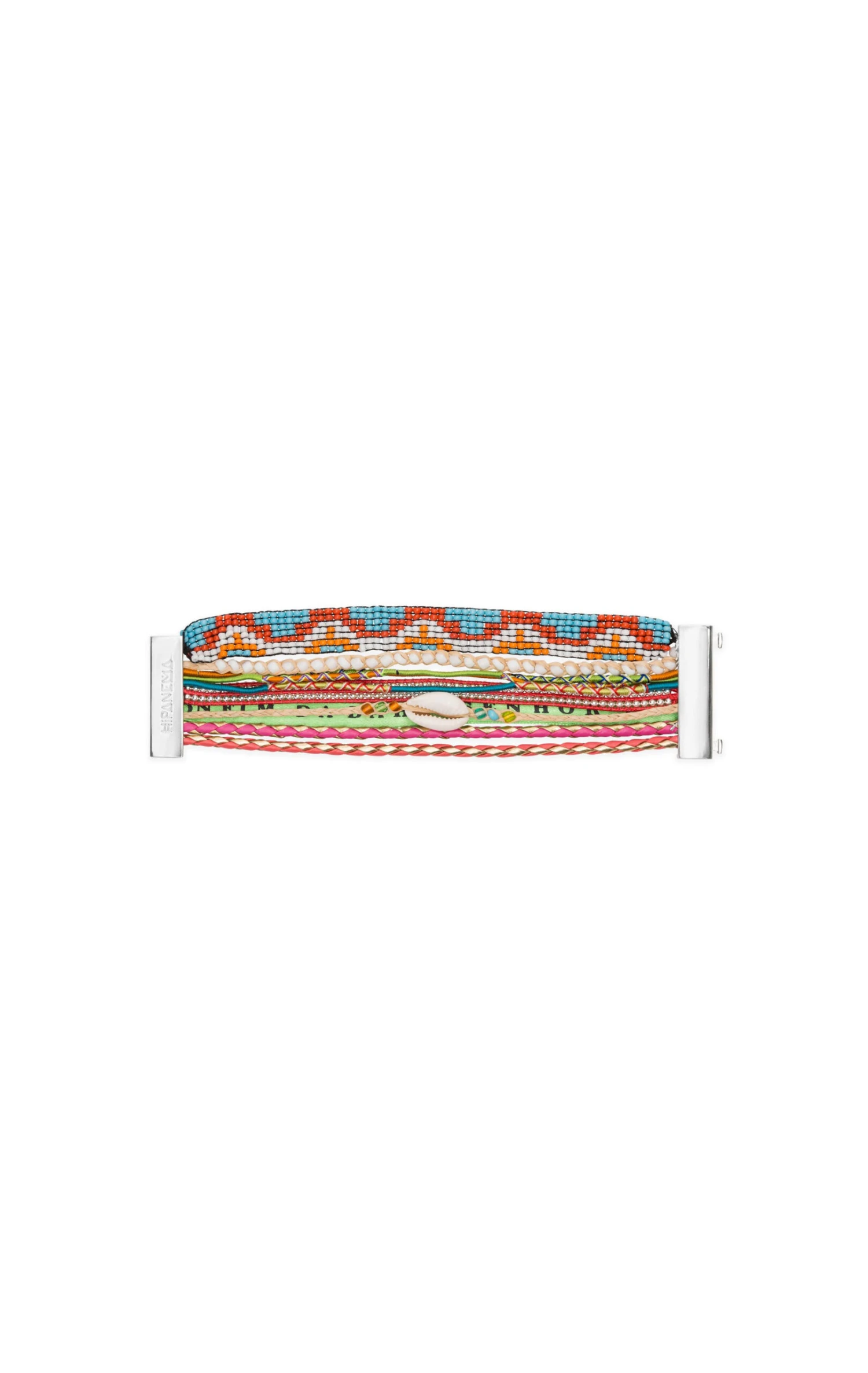 Ici est prĂ©sentĂ© la manchette « Version 06 », composĂ©e de liens de coton multicolores, d’un bracelet brĂ©silien en perles orange, rouge, blanc et turquoise, d’un coquillage cowrie et du lĂ©gendaire ruban sehnor da bonfim porte-bonheur.